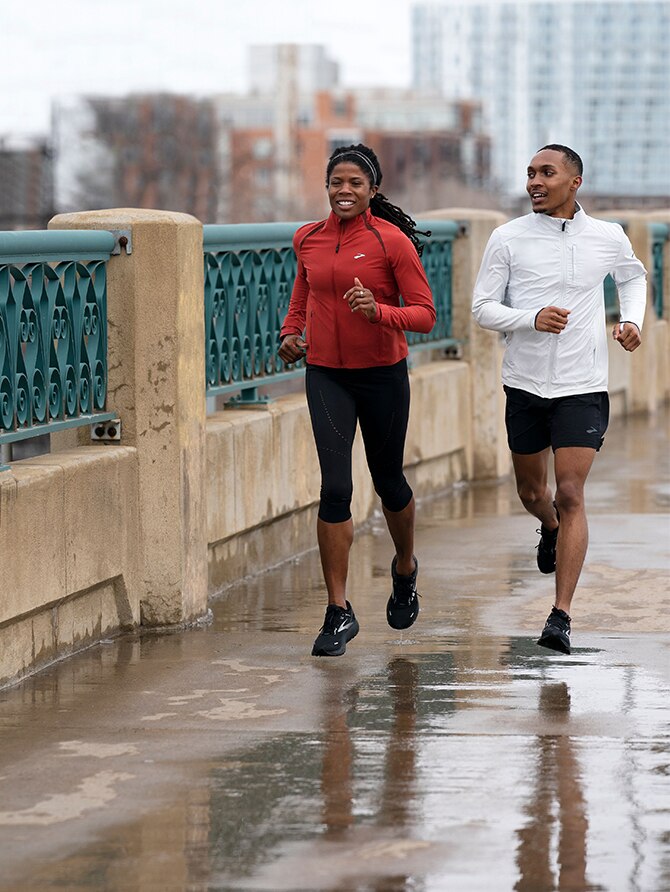 Außerdem haben wetterfeste Laufjacken den Vorteil, dass sie leicht sind – wie zum Beispiel die Brooks Carbonite – und dich durch ihr reflektierendes Material auf der Straße besser sichtbar machen. Entdecke hier, wie du beim Joggen im Dunkeln sichtbar bleibst. Kleide dich am besten so, als wäre es mindestens 10 Grad wärmer – denn genau wie das Material einer wasserfesten Laufjacke dich zum Schwitzen bringen kann, kann auch eine zu dicke Laufjacke zu Überhitzung führen.
