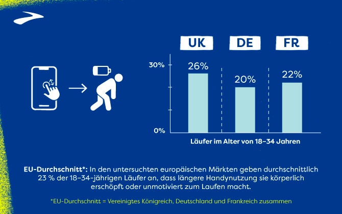 Im Vereinigten Königreich stimmten mehr als ein Viertel der Läufer*innen in der Altersgruppe der 18- bis 34-Jährigen der Aussage zu: „Ich fühle mich körperlich ausgelaugt oder nicht motiviert zum Laufen, nachdem ich mein Handy länger benutzt habe.“ Allerdings gibt eine beträchtliche Anzahl von Läufer*innen an, dass sie ihre Bildschirmzeit lieber nicht wissen möchten. In Deutschland liegen die Zahlen etwas niedriger: Dort geben 20 % der Läufer*innen dieser Altersgruppe an, dass sie sich nach längerer Handynutzung körperlich ausgelaugt oder nicht motiviert zum Laufen fühlen. In Frankreich stimmen 22 % der Läufer*innen dieser Gruppe derselben Aussage zu.