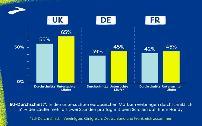 In den befragten europäischen Märkten verbringen durchschnittlich 51 % der Läufer*innen täglich mehr als zwei Stunden damit, auf ihrem Handy zu scrollen.