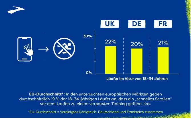 Am aussagekräftigsten sind aber vermutlich die Aussagen der Läufer*innen selbst, dass soziale Medien ihr Lauftraining entgleisen lassen, trotz ihrer guten Vorsätze. In den von der Umfrage erfassten europäischen Märkten geben durchschnittlich 19 % der 18- bis 34-jährigen Läufer*innen an, dass sie ihr Workout verpasst haben, weil sie vor dem Laufen noch schnell gescrollt haben.