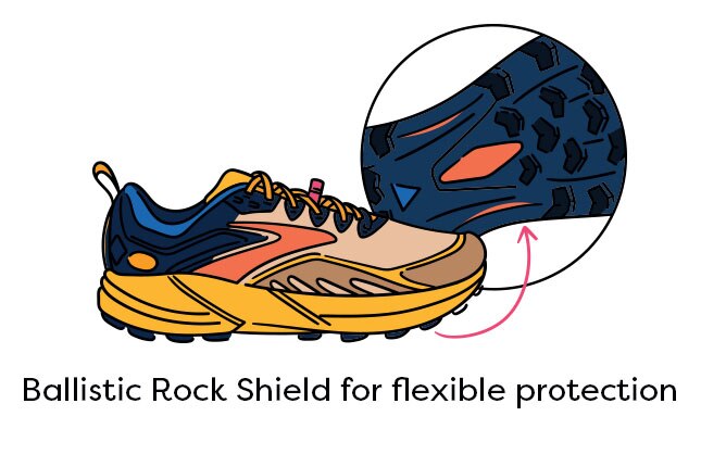 The Ballistic Rock Shield is a sheath between the outsole and midsole that helps deflect impact from sharp objects while also adapting more easily to uneven terrain.