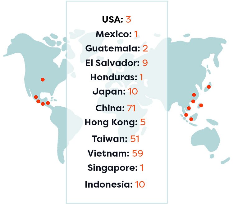 Mexico 2, Belgium 1, China 25, Taiwan 14, Japan 5, South Korea 3, Hong Kong 1, Vietnam 6, Indonesia 2, Singapore 1