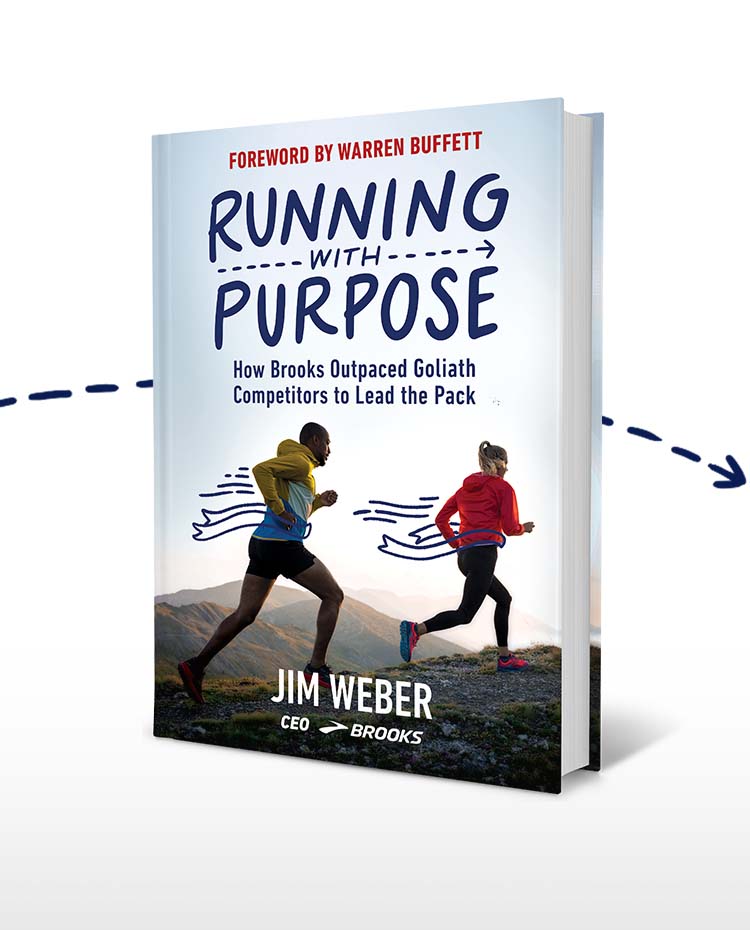 “Jim’s passionate story will inspire you just as it inspired me in 2012 to recognize that he would make Brooks a stand-alone star at Berkshire.” Warren Buffett Chairman and CEO of Berkshire Hathaway Inc. Play video Pause video In Running with Purpose, you will find a highly engaging read with insights, inspirational stories, and tangible takeaways for current and aspiring leaders, entrepreneurs, brand builders, and especially the 150+ million runners worldwide and those in the broader running community who continually invest in themselves and put positive energy into the world. The untold David vs. Goliath challenger brand story in which Brooks’ bold strategy and unique brand positioning fueled its move from the back of the pack to lead. The key to building a purpose-driven brand that is oriented around customer obsession, building trust, competing with heart, and having fun along the way. The six clear leadership lessons Jim has learned along his path and applied at Brooks to help managers at all levels develop into authentic leaders. How Berkshire Hathaway’s support and influence provided a tailwind for Brooks’ business and brand to surge. A revealing look at the ups and downs of Jim’s personal journey, which led to his conviction that life is too short not to enjoy what you do and the people by your side. Praise for Running with Purpose Squiggle Icon As a long-time Brooks athlete, it’s been easy to draft off the brand's approach of reaching for the biggest goals regardless of being labeled the underdog. Jim Weber goes beyond the goal and gives readers the hows and whys behind the company’s success. This book will motivate and guide those looking to have a breakthrough performance and solidifies my belief that Weber is one of the greatest leaders in business.” Des Linden – Boston Marathon Champion Jim Weber beautifully demonstrates the power and joy of leading with purpose and authenticity and how it can create stunning business results while being a force for good. A wonderful book that is both inspiring and very practical.” Hubert Joly – Former Chair & CEO, Best Buy Co., Inc., and Wall Street Journal Bestselling Author of The Heart of Business Running with Purpose is a master class in focus, tenacity, team building, innovation, and culture. While I have known Jim Weber for many years, I can only now understand the depth of the struggles he faced on his way to being one of the great leaders of a generation and creating a brand that has motivated millions of runners to Run Happy. I can say with certainty that all managers and leaders will find helpful tools in this book to build their businesses for success.” Robin Thurston – CEO, Outside, Inc. Over the last twenty years as a Brooks athlete, I’ve watched Jim Weber turn a gasping business into a champion in the industry by not just being a CEO who wants to win the race, but one who leads from the front and brings out the best in everyone. His captivating career path proves that passion + precision elevates performance every time.” Scott Jurek – Ultramarathon Champion and New York Times Bestselling Author of Eat & Run and NORTH Running with Purpose is as inspirational, insightful, and educational as the company it features and the leader who wrote it. The story of how Brooks rose from the ashes to become a force in running is full of important lessons on both formulating and executing strategy. Read it to learn how performance brands and great teams are built, and how successful leadership requires not just vision but courage and discipline.” Kusum Ailawadi – Professor, Tuck School of Business, and Co-author of Getting Multichannel Distribution Right I regard Jim as a miracle worker. The institution is the length and shadow of this man.” Charlie Munger – Vice Chairman, Berkshire Hathaway Inc. Order Running with Purpose now Purchase your copy of Running with Purpose at any of these booksellers: Amazon Apple Barnes and Noble Books-A-Million Bookshop Google Play Audible Libro.fm About Jim Weber Author, Running with Purpose, Brooks CEO 2001 - 2024 Jim Weber joined Brooks’ Board of Directors in 1999 and was named CEO in 2001. He stepped down in 2024 after 23 years in the position. He is credited for the Seattle-based running company’s aggressive turnaround story. The business and brand success caught the attention of Warren Buffett, who declared Brooks a standalone subsidiary company of Berkshire Hathaway Inc. in 2012. Weber’s professional journey includes leadership roles for several consumer product brands such as chairman and CEO of Sims Sports, president of O’Brien International, vice president of The Coleman Company, and various roles with The Pillsbury Company. Weber was also managing director of U.S. Bancorp Piper Jaffray Seattle Investment Banking practice and a commercial banking officer at Norwest Bank Minneapolis (now Wells Fargo). He received a bachelor’s degree from the University of Minnesota's Carlson School of Management and a Master of Business Administration degree with high distinction from the Tuck School of Business at Dartmouth College. Find Jim on social: @jimweberseattle (Twitter), Jim Weber (LinkedIn) News and notables Jim Weber and Running with Purpose are making headlines: The New York Times Corner Office: The CEO of a Running Company Who Can No Longer Run Read article Acquired Podcast Arena Show Part II: Brooks Running (with CEO Jim Weber) Connect to podcast 2022 SXSW Keynote Watch video Giving back Brooks believes in a world where everyone is welcome to run and has a place to do it. Jim Weber will donate all profits from Running with Purpose to the Brooks Booster Club, a needs-based grant program that provides performance running footwear, apparel, and funding to under-resourced high school cross country and track teams. Learn more