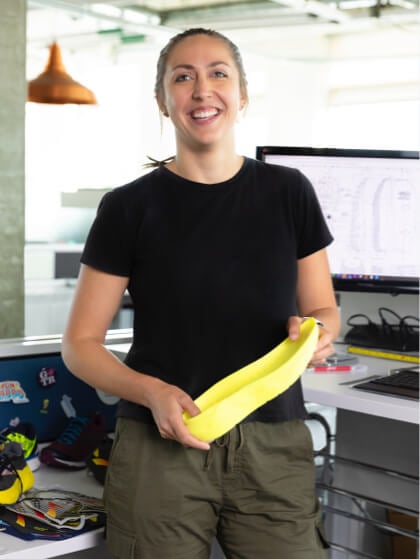 En tant que conceptrice de la Caldera 6, Claire Brensdal a dirigé l’équipe du projet ; elle était en charge de définir les matériaux à utiliser, en s’assurant que les objectifs de durabilité étaient atteints et en vérifiant que la chaussure atteignait les prestations désirées par l’équipe.