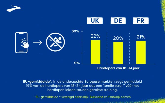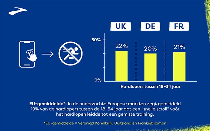 In het Verenigd Koninkrijk was ruim een kwart van de hardlopers in de leeftijdscategorie 18-34 jaar het eens met de stelling: “Ik voel me fysiek uitgeput of niet gemotiveerd om te hardlopen na langdurig gebruik van mijn telefoon.” Een aanzienlijk aantal hardlopers gaf echter aan: “Ik weet liever niet hoeveel tijd ik achter een scherm doorbreng.” In Duitsland liggen de cijfers iets lager: 20% van de hardlopers in deze leeftijdsgroep is het eens met de stelling: “Ik voel me fysiek uitgeput of niet gemotiveerd om te hardlopen na langdurig gebruik van mijn telefoon”, en in Frankrijk is 22% van de hardlopers in deze groep het eens met dezelfde stelling.