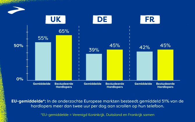In de onderzochte Europese markten besteedt gemiddeld 51% van de hardlopers meer dan twee uur per dag aan scrollen op hun telefoon.